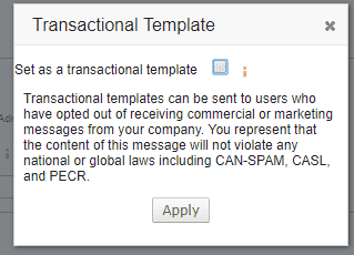 Image of popup asking the user to make a template transactional and reminding the user that these emails must comply by privacy laws.