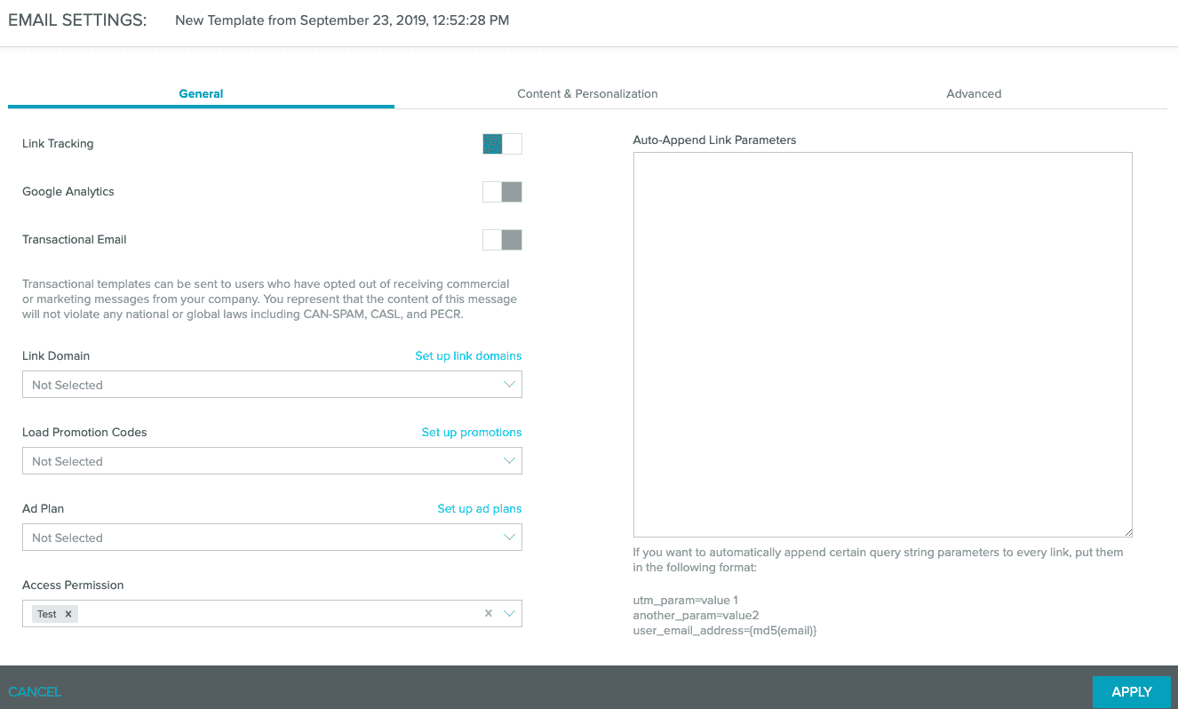 2. In the General tab on the Settings Editor, locate Transactional Email.