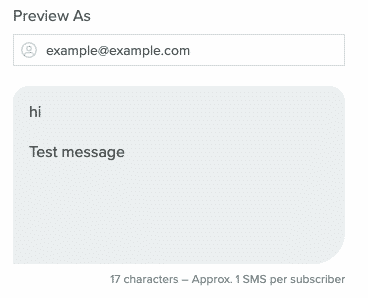 The same Zephyr variables that work in email messaging also work in SMS messaging. In the following preview, example@example doesn't have a first name in the system.
