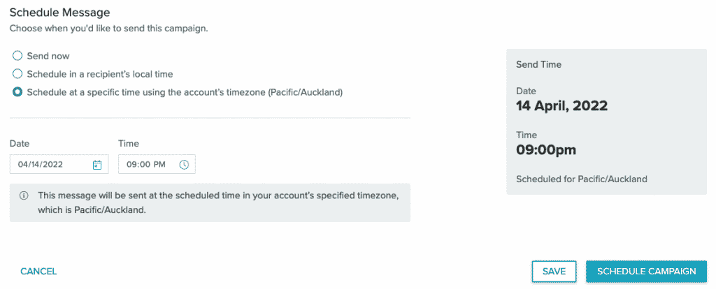 - Schedule your message. You can send immediately, select a day and time to send your message in the recipient's local time, or schedule a specific day and time in your account's local time.