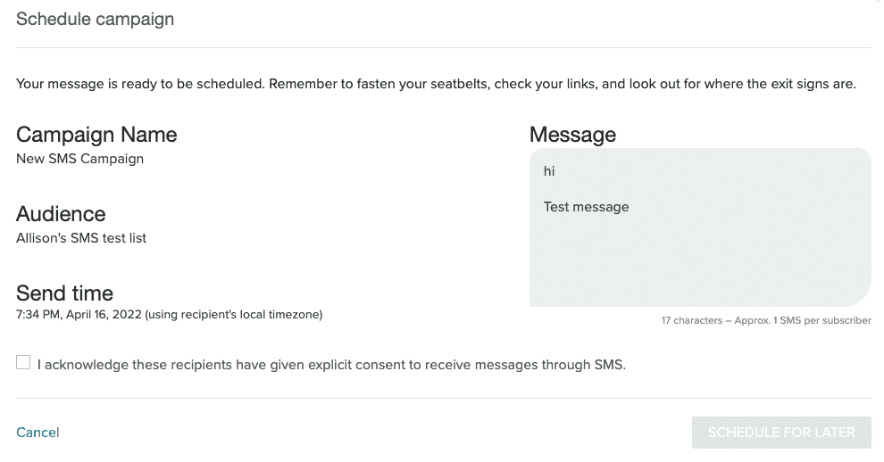 Check that the information in the Schedule campaign modal is correct and select the checkbox to acknowledge that all recipients have given explicit consent. Once you select the checkbox, the Schedule For Later button turns blue. Select the button to schedule your message.