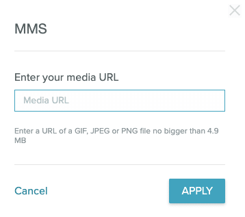 - Enter a publicly available URL in the MMS modal and select Apply. Note: The GIF, JPEG, or PNG file must not exceed 4.9MB. The entire MMS message is size-limited to 5MB.