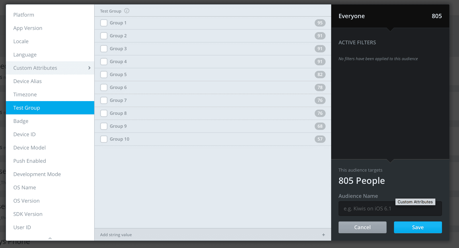 Mobile's Audience Builder allows you to use 10 automatically generated random deciles of your app's user base, labeled Group 1-10, for testing and other segmentation purposes.