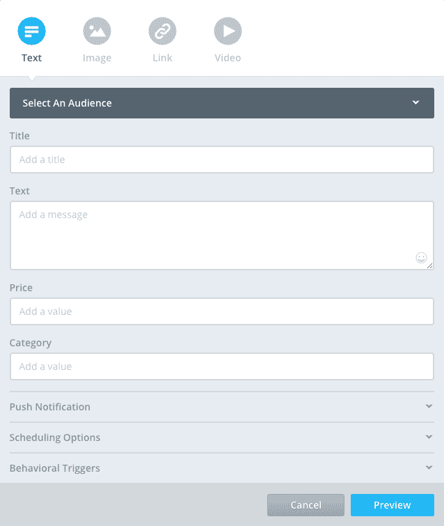 - Add these new Message Attribute fields to your app within the Settings/Developer area. These new fields will then show up whenever composing an in-app message, as shown in the image below.