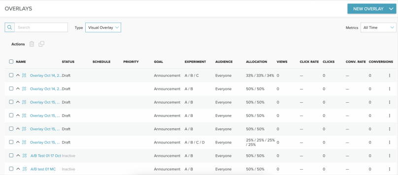 - Name - Internal name you have set for the overlay. Click to view or edit settings. Each overlay also has an icon to show which type it is: Visual or Classic.