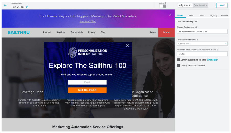 Overlays require Onsite. If you do not see the Onsite menu at the top of My Sailthru, please contact us to inquire about adding these features. Overlays also require that the latest JS is embedded on your site.