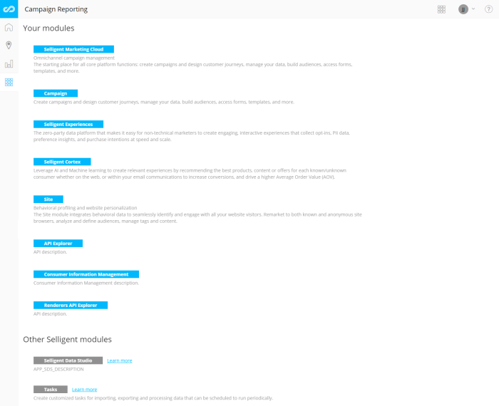 Other Selligent modules — Lists all other available modules. You can request additional info on these modules by clicking the learn more link. If you do not have access to the module because of user rights, you will be redirected to the Selligent website.
