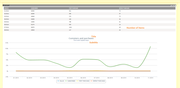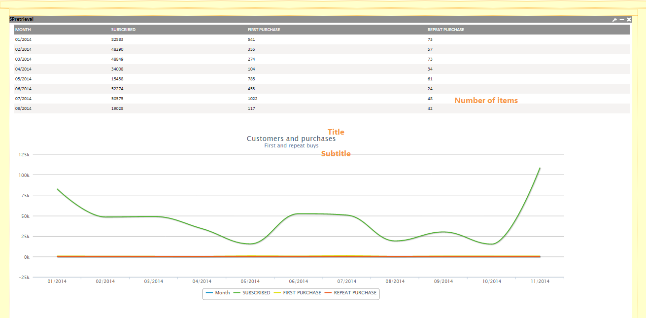 Example: You could create a Stored Procedure Report that retrieves, per month, the number of people subscribed, number of first purchases, and number of repeat purchases.