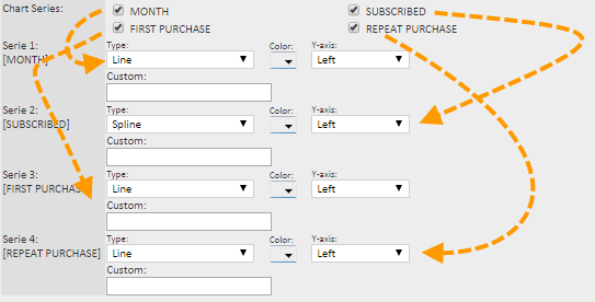 • Chart series — Use this to create a different chart series per column. Select a column to add a series and set the properties for that series, such as type of chart, color and reference axis.