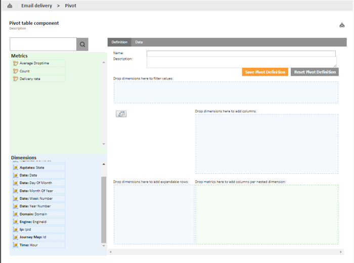 Average drop times, count, and delivery rate are metrics that can be used in the pivot table. The dimensions are based on the actionqueue table.