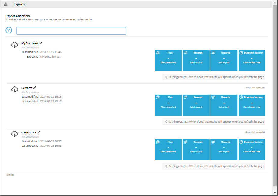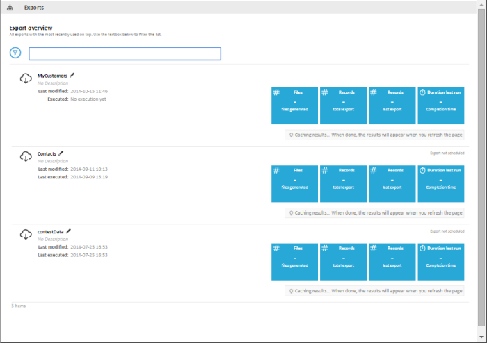 Dashboard: An overview of all exports with the most recent ones at the top.