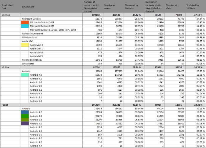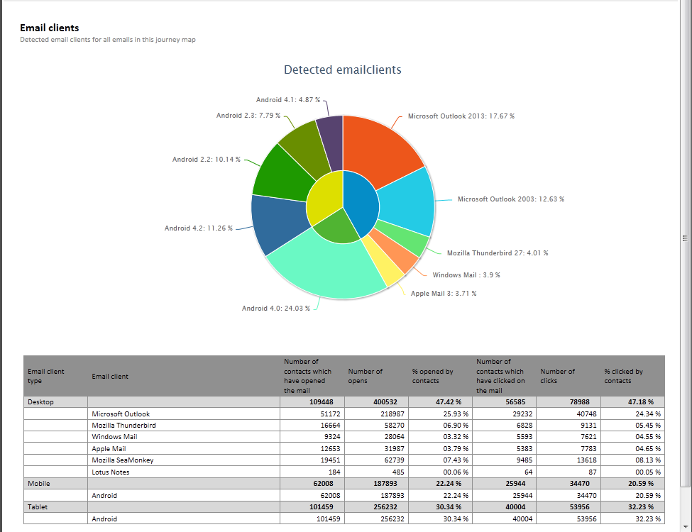 In the table, email clients are listed per device. Clicking a specific email client provides more details on the different versions used.