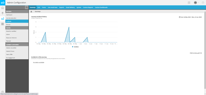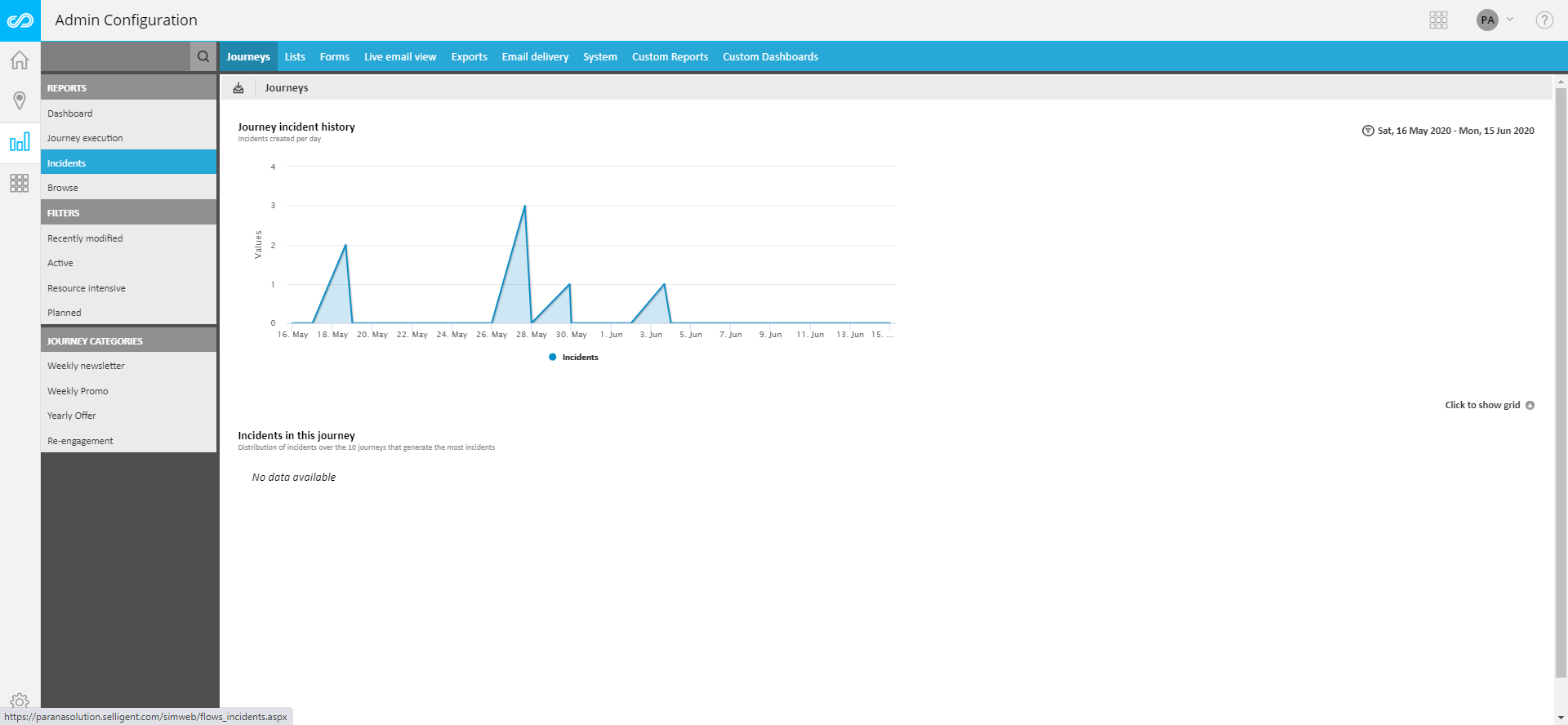 Incidents include anything that causes a problem during execution of the journey, as reported in the system logs. Some examples of issues would be an object that cannot be found or a link that is not valid, etc.