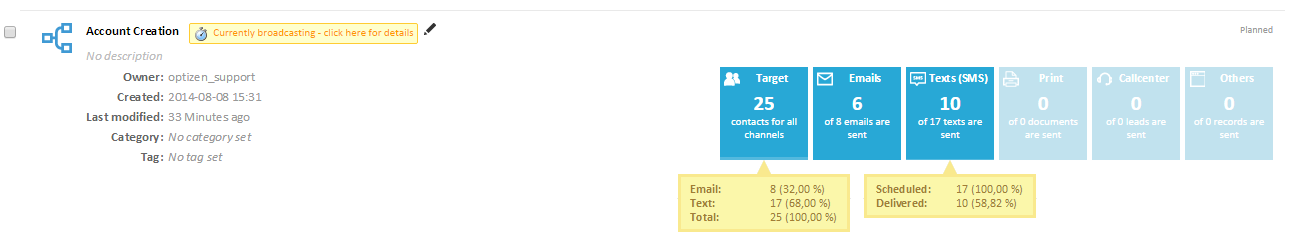 Journeys currently broadcasting are indicated as such. Hover over the notification to access reporting on delivery numbers for the channels used, and interaction numbers per channel.