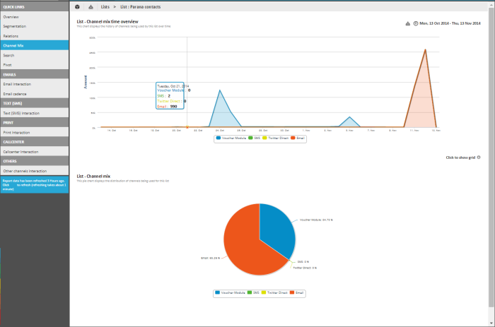 A single list can be used in several journeys,with each journey using different channels. Or you could use different channels in one single journey. The report provided here groups all data per media that is used by the selected list to distribute messages. This includes social publish, emails, print, interfaces, etc.