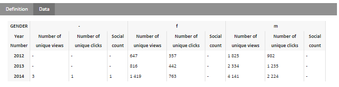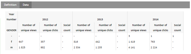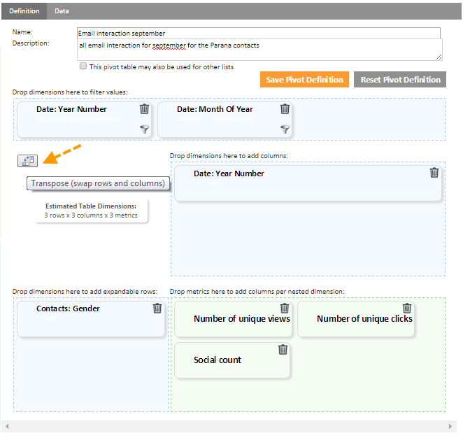 To compare the different years, it might probably be easier to display the year as a rows and the gender as columns. Without having to restart the entire definition, it is possible to swap and inter-change the dimensions between columns and rows. To do so, click the 'Transpose' icon on the definition page.