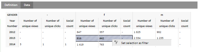 From this result table you can filter the information. Select one or more dimensions by holding the left mouse button and going over the cells. Right click the highlighted section and select 'Set selection as filter'.