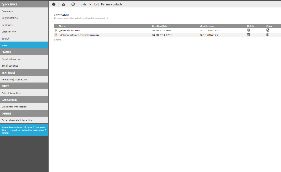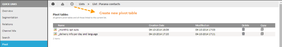 1. From a selected list, select the'Pivot'entry in the tree. All generic pivot tables and pivot definitions created for the selected list are displayed.