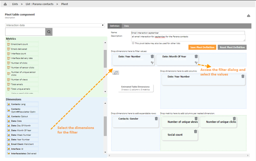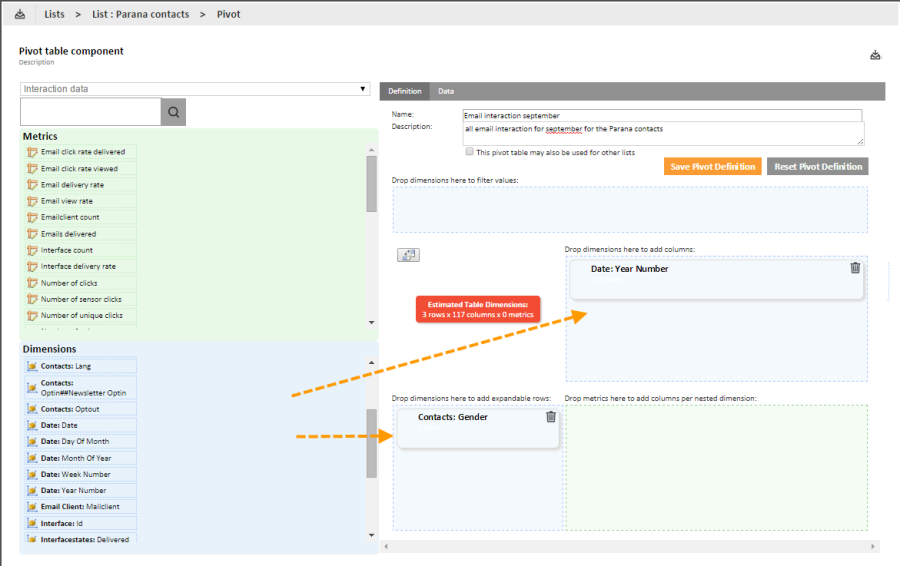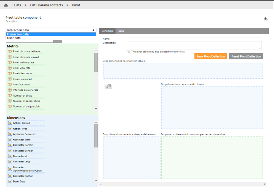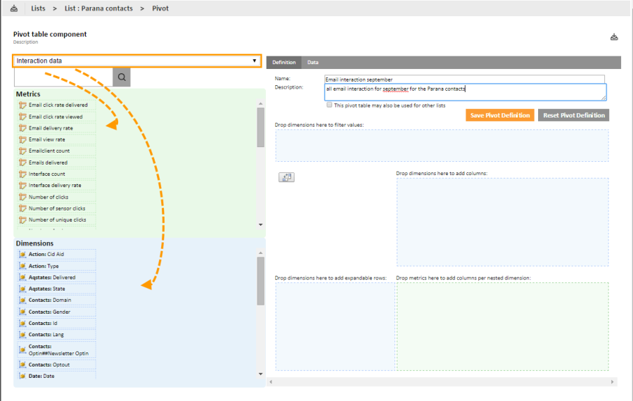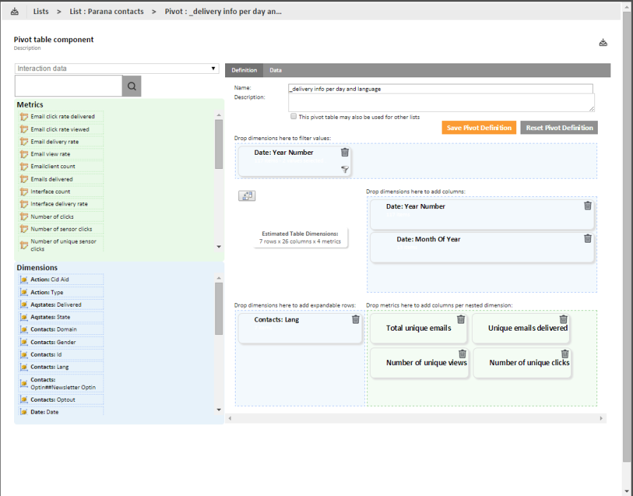 A remark is in place here. If a pivot table can be used by other lists, it is possible that the dimensions in the table (a dimension is based on a field) do not exist for that list. Selligent will in that case alert the user and remove the redundant dimensions from the definition.