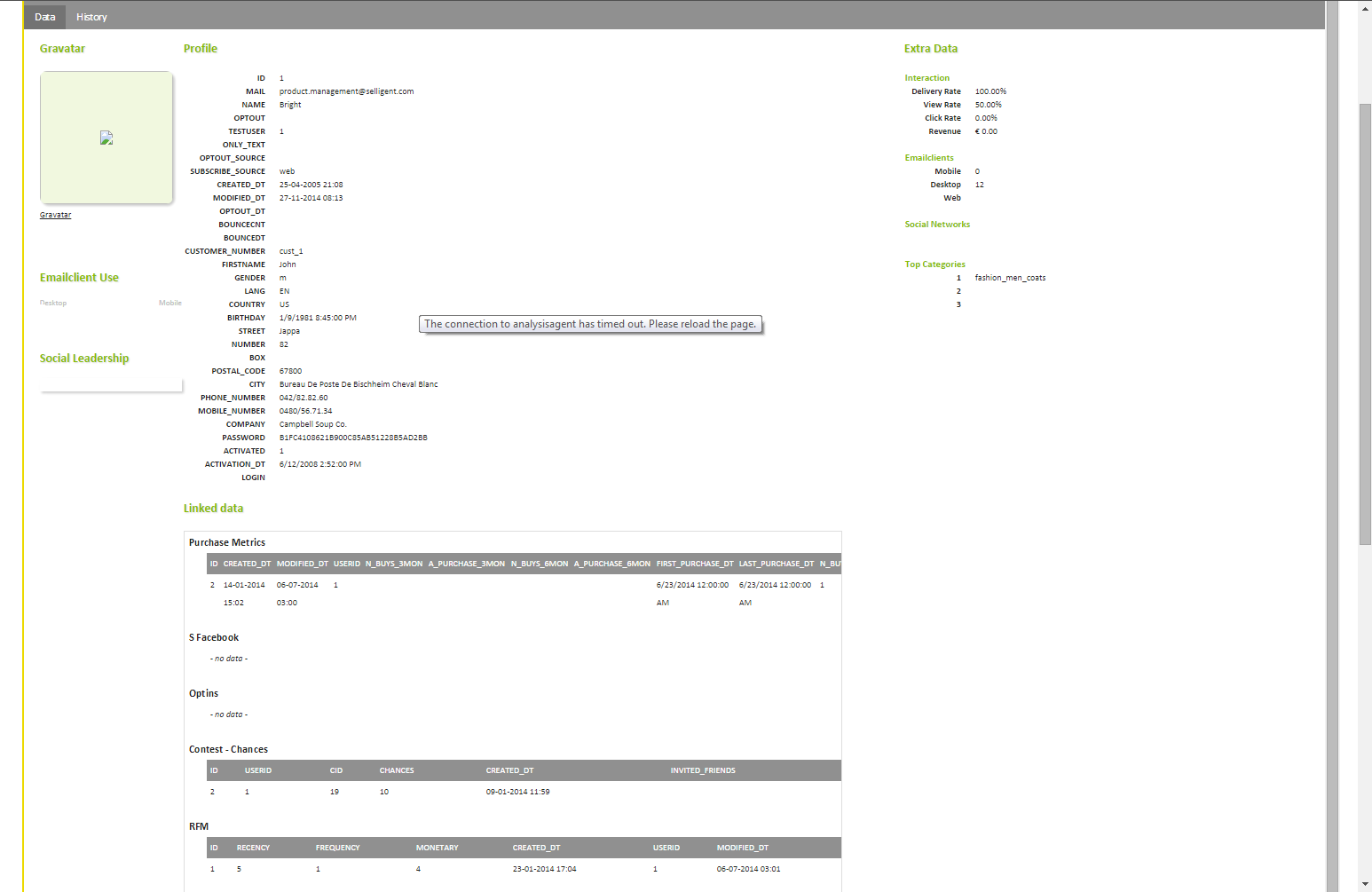 All available information on the selected contact is retrieved, from the Audience list and linked lists as well. You'll find information on social interaction, purchase metrics, preferences, etc.
