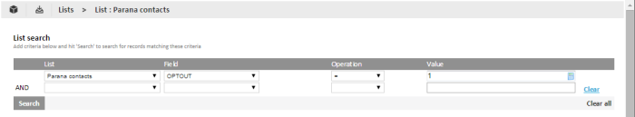 For operators not requiring any values (IsEmpty), the Value field is removed. Use the 'Clear' and 'Clear all' buttons to remove one criteria or all criteria.