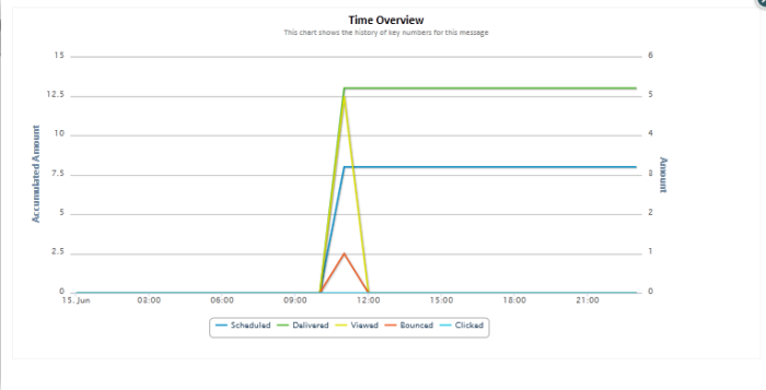 - Number of emails scheduled, delivered, viewed, bounced and clicked in the first 10 days after the last email was sent