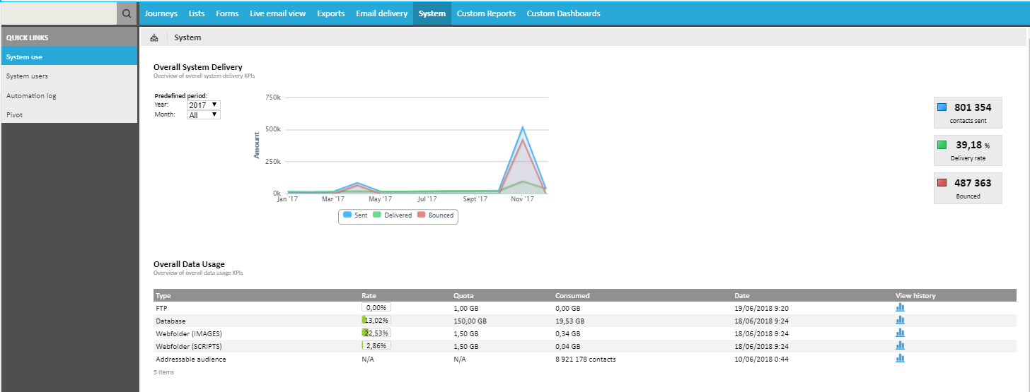 The System report allows follow-up on the use of the whole Selligent environment over the years.