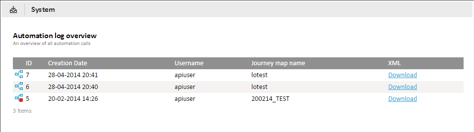 The ‘Automation log’ provides a list of all journeys that have been generated by the broadcast API. The button‘Download’provides the XML that is used to create the journey: