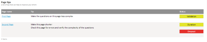 - Page tips — A list of tips is available that might help analyzing and improving the form.