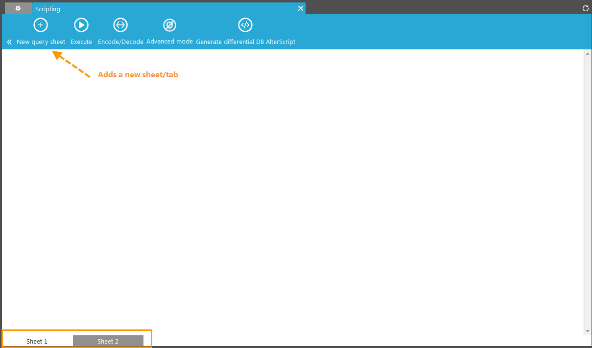 Multiple sheets can be created to design and view SQL commands. The button 'New query sheet' adds a new sheet (tab) at the bottom.