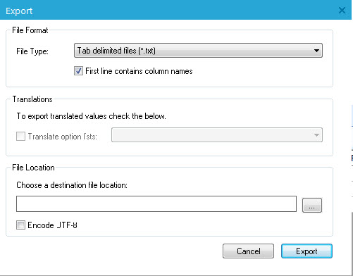 An export to file requires following export options: