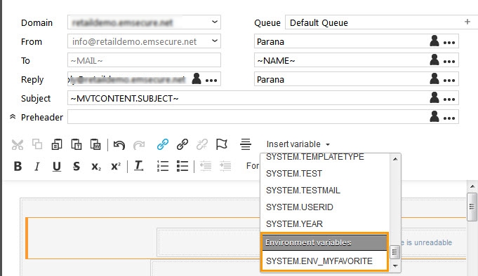 - In the Editor from the 'Insert variable' in the WYSIWYG editor of a message. The variable can this way be used within message content.