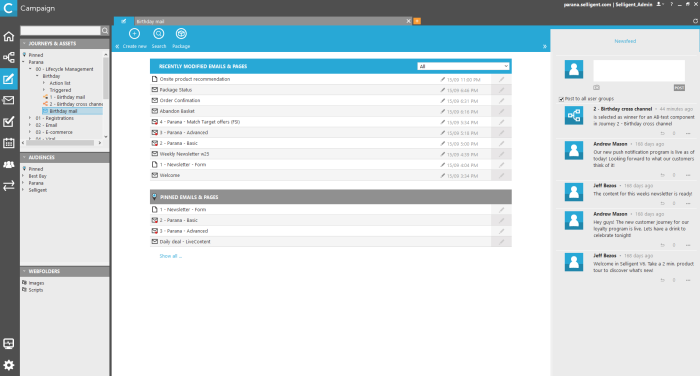 Journeys and Assets: the tree view provides a hierarchical view of all the messages in Selligent Campaign. The tree view facilitates the organization of your messages in logical folders. You can create multi-level folders, like in windows explorer. Depending on your user rights, you can create, delete, move, view or modify folders and messages.