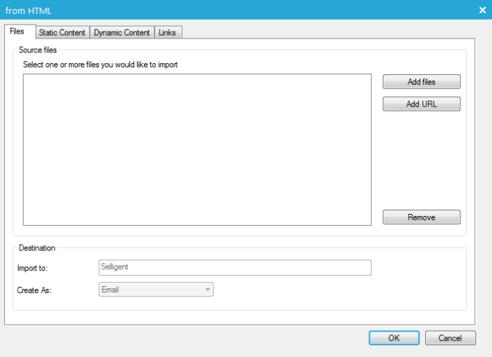 The 'Files' tab is used to select the files to import. This can be an html file or an URL. When URL is selected, the corresponding online page is imported.