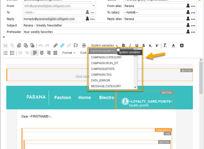 Apart from audience fields and profile extension fields, Selligent also recognizes system properties. These predefined properties are useful when the message is generated.