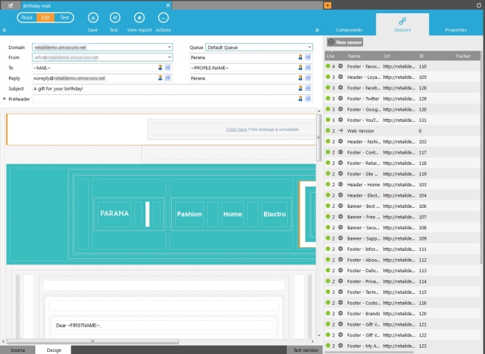The 'Web version' sensor (ID = 0) is added to email messages to allow contacts to read the mail message in a web browser in case they are unable to view the mail correctly in their email client. When you create a new email, the web version sensor is by default added and available from the Sensor window, even if no sensors have been defined yet. A default section for the web version link is automatically added to the email, "View this email in your browser", with a constraint SYSTEM.MAIL=1 to show it only in the email client and not in the browser. As best practice, it is no use showing the web version sensor when you are already viewing the email in a web browser. You can change this section if needed. See Dynamic section for more information.