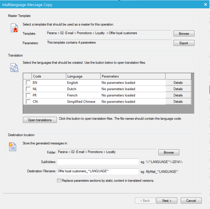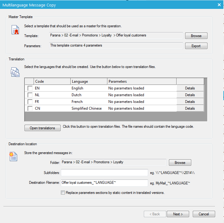 7. Next, define the destination of the translated messages. A folder, subfolder and file name can be defined. By default the translated message is created in the same folder as the 'master' message.