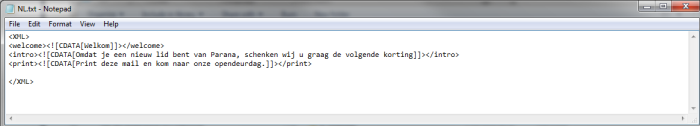 The translation of these parameters is stored in a file. One translation file per language is required. The name of the file must be the same as the language code. (E.g. for the translation to dutch the language code is NL and thus the filename will be NL.txt)