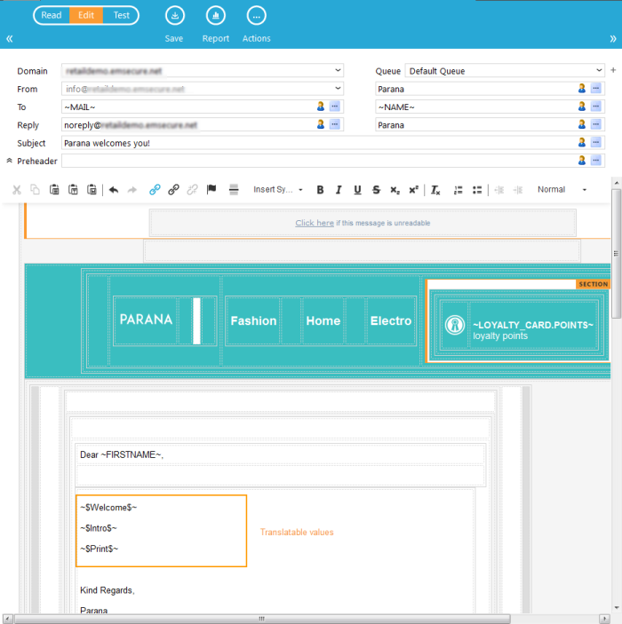 When translation files are used, first a 'master' message is created in which parameters are put for the parts of the message that are to be translated. (e.g. ~$intro$~).