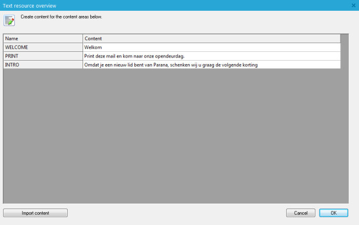 5. On the following dialog, Press the button 'Import content' and browse for the location of the translation file. The content is loaded.