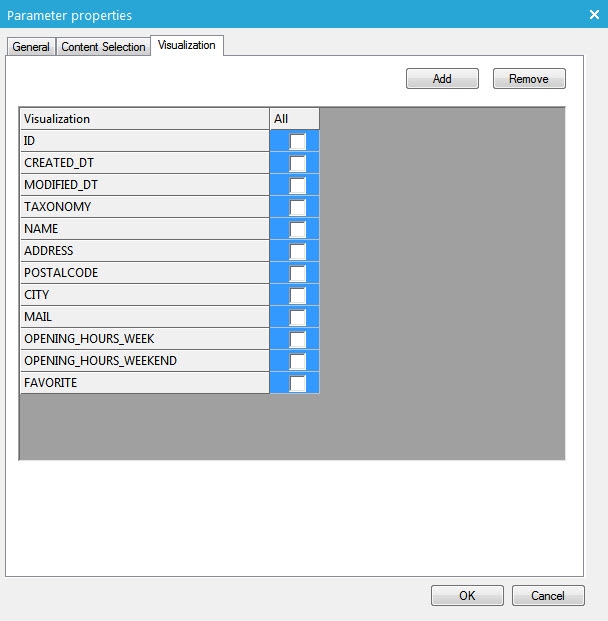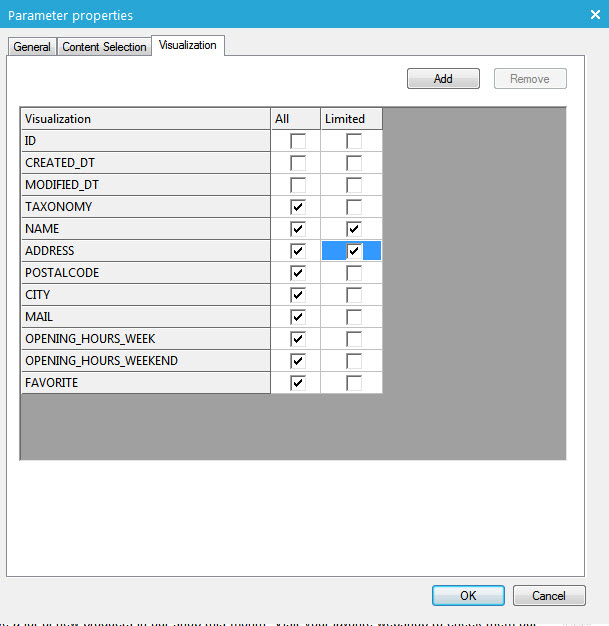 To add a new one, simply click the button 'Add' and set a name. A series of check boxes allows now selecting the fields to include in this particular visualization: