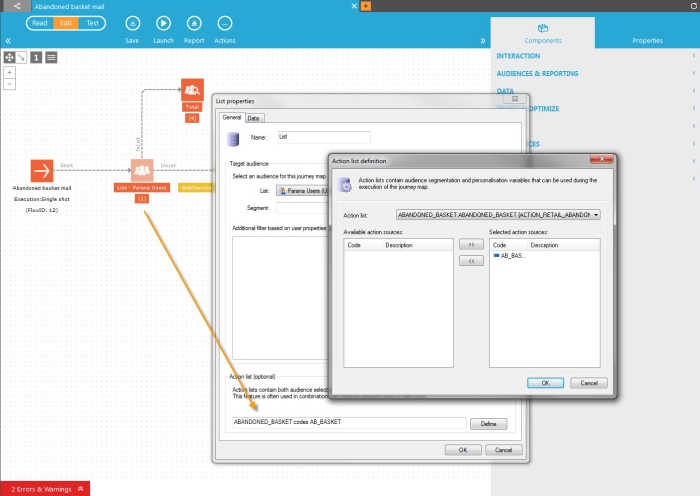 In a journey an audience component can be configured to use an action list. This also requires the selection of 1 or more action codes that are defined on the action list. Whenever the journey 'sees' new records in the action list with one of the selected action codes it processes them as defined in the journey. The journey will only process records with a certain value, e.g. "Basket_abandon". Multiple journeys can use the same action list, each processing records with a specific value. For instance, a second "order confirmation" journey could process records with ACTIONCODE value "order_confirm"