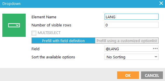 - Prefill with field definition — Prefill the drop down list with the translated values from the option list linked to this list field.