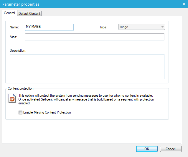 - Content protection — When this option is checked, the email will not be sent when no content is entered for this component in Express or via broadcast API. This is determined per contact. This is typically used on an Article Container with a 'match' filter. With this filter, you can match articles to a contact, based on interests, top-clicked categories, etc. If a contact does not have any matching articles, the email is not sent to that contact. But Content Protection can be enabled on all dynamic template components. A default image must be selected to display if this content is not changed in Express or via broadcast API.
