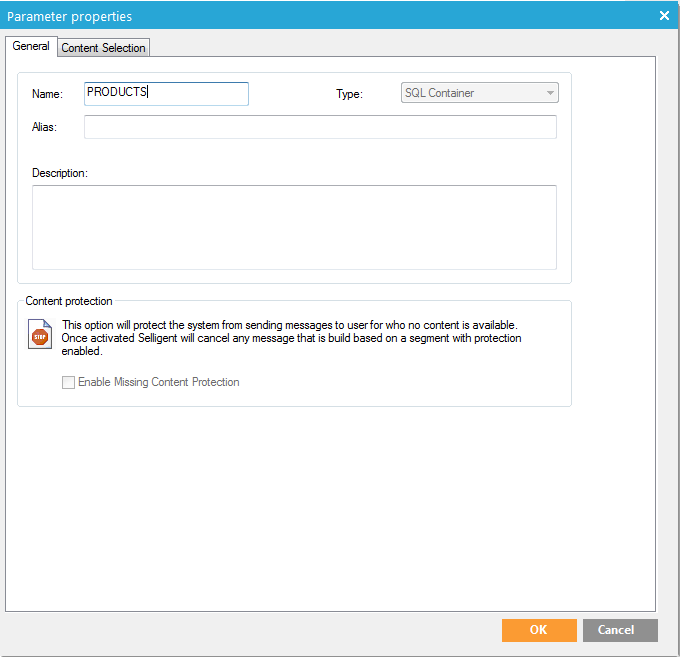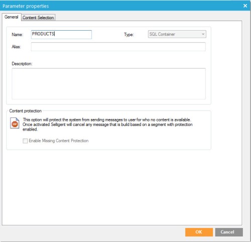 - Content protection — When this option is checked, the email will not be sent when content is missing. This is the default for an Article Container, but not needed for SQL Containers.