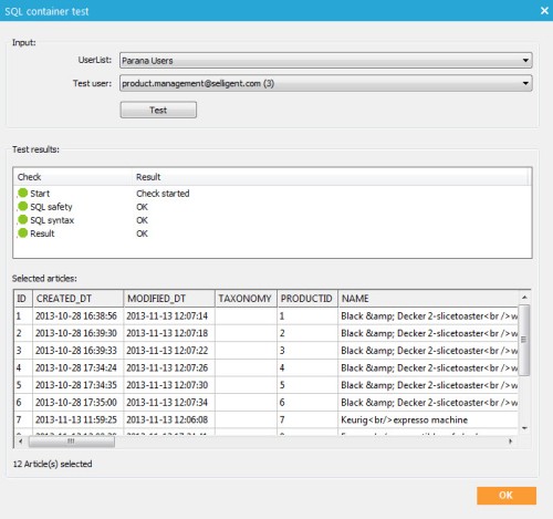 Through this dialog, the SQL statement can be tested against the database. An Audience list and test user must be selected to be able to fill out any profile fields used in the where clause. When the 'Test' button is hit the test result is displayed. At the bottom of the dialog, the articles returned by the SQL statement are listed.