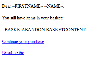 2. In the email add the line ~BASKETABANDON.BASKETCONTENT~
