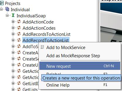 - Click 'OK'. When loaded, you should see a listing of the Individual API methods. Right-click the AddRecordToActionList method and select 'New request'
