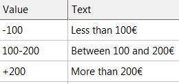 - Answers: Values: -100, 100-200, +200, Text: Less than 100€ - Between 100 and 200€ - More than 200€