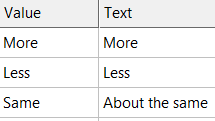 - Answers: Values: More - Less - Same, Text: More - Less - About the same
